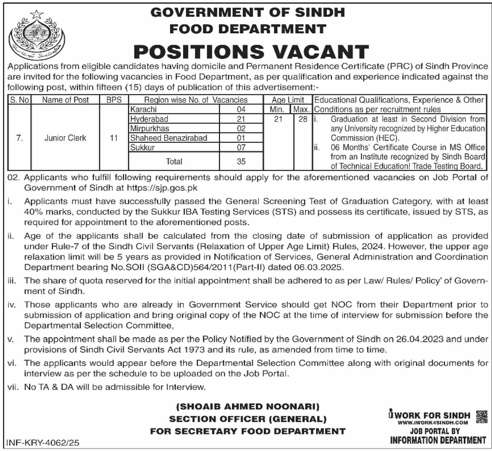 Candidates, if you are seeking Food Department Jobs 2025 in Sindh, the Online Application is available. Then it would help if you tried to complete the Food Department Jobs because here you can easily apply for these vacancies: Junior Clerks.