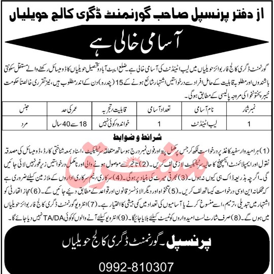 Candidates, if you are seeking Government Degree College Jobs 2025, apply now. Then it would help if you tried to complete the Government Degree College Jobs because here you can easily apply for this vacancy: Lab Attendant.