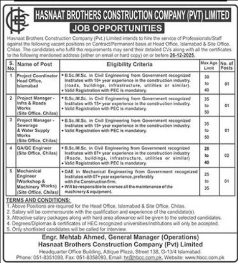 Both Male and Female candidates can apply for these Construction Company Jobs who have the Qualification: B.Sc./M.Sc. in Civil Engineering from Government-recognized Institutes with 07+ years of experience in the construction industry (Roads, buildings, infrastructure, utilities, or similar.) Valid Registration with PEC is mandatory. DAE in Mechanical Engineering from Government-recognized Institutes with 07+ years of experience, preferably with a Construction firm. Will be responsible for overseeing all the maintenance of the machinery & equipment, and many more experienced candidates should apply before 26 December 2025.