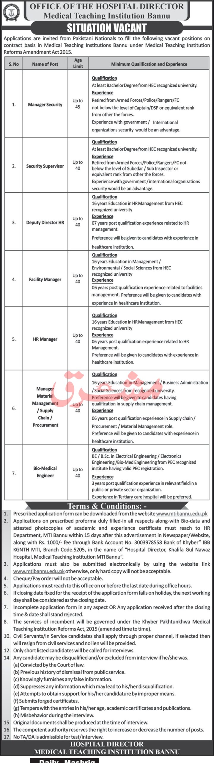 Candidates, if you are seeking Medical Teaching Institution Bannu Jobs 2025 Online Application, yes. Then it would help if you tried to complete the Medical Teaching Institution Bannu Jobs because here you can easily apply for these vacancies: Manager Security, Security Supervisor, Deputy Director HR, and Facility Manager.
