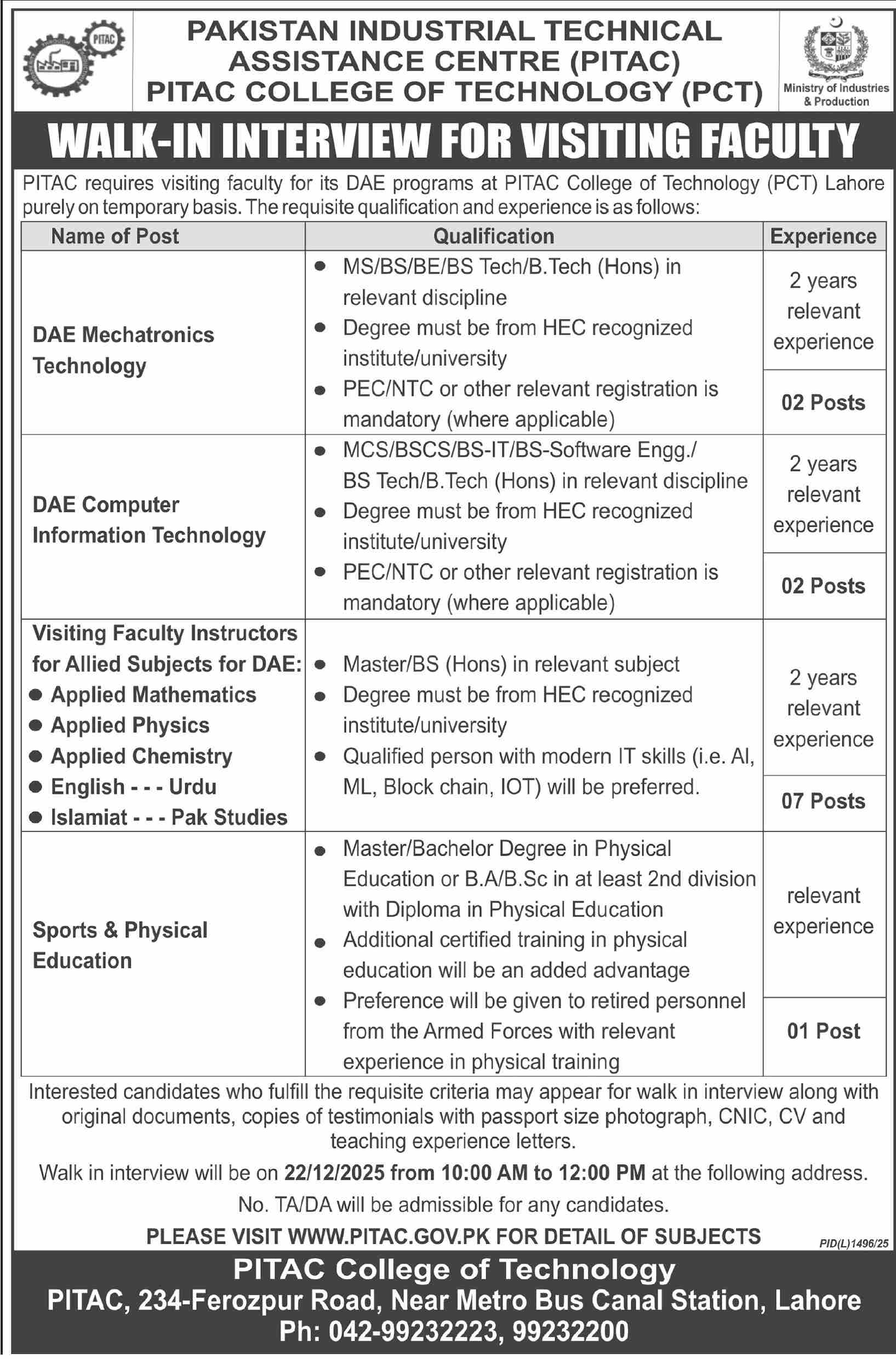 Candidates, if you are seeking Pakistan Industrial Technical Assistance Centre Jobs 2025, Apply Online yes. Then it would help if you tried to complete the Pakistan Industrial Technical Assistance Centre Jobs because here you can easily apply for these vacancies: DAE Mechatronics Technology, DAE Computer Information Technology, Visiting Faculty,, Instructors for Allied Subjects for DAE: Applied Mathematics, Applied Physics, Applied Chemistr,y English, Urdu, Islamiat, Pak Studie,s Sports & Physical Education.